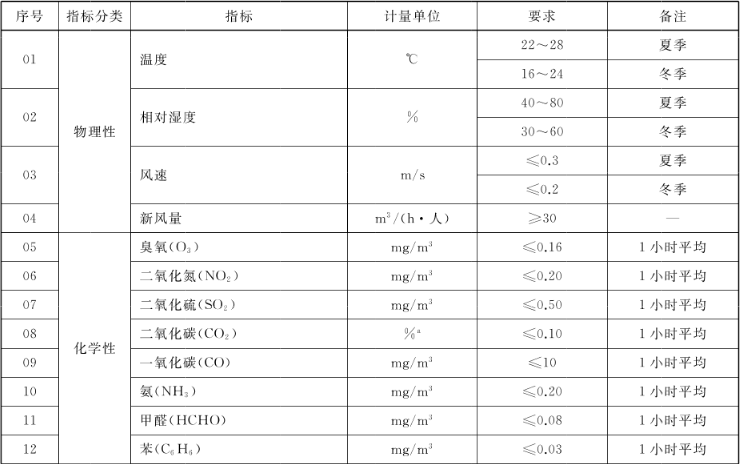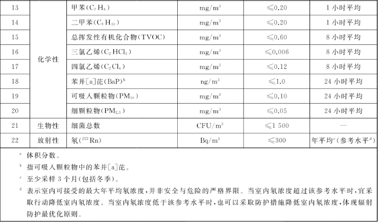 整体来看,调整的指标除了二氧化碳由“日平均值”修改为“1小时平均”,其他指标均有收严;《标准》规定了室内空气质量的物理性、化学性、生物性和放射性指标及要求,具体要求见下表2。